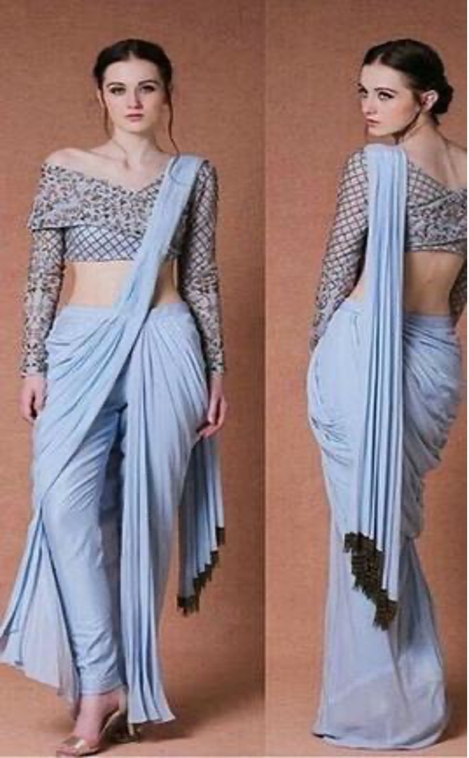 Yes, it is 2021. Break the monotony of preconceived standards and notions by going ahead with a pant saree or a skirt saree. A lovely ruffled blouse along with a pre stitched pant saree is a mind-boggling conception to appreciate variation.